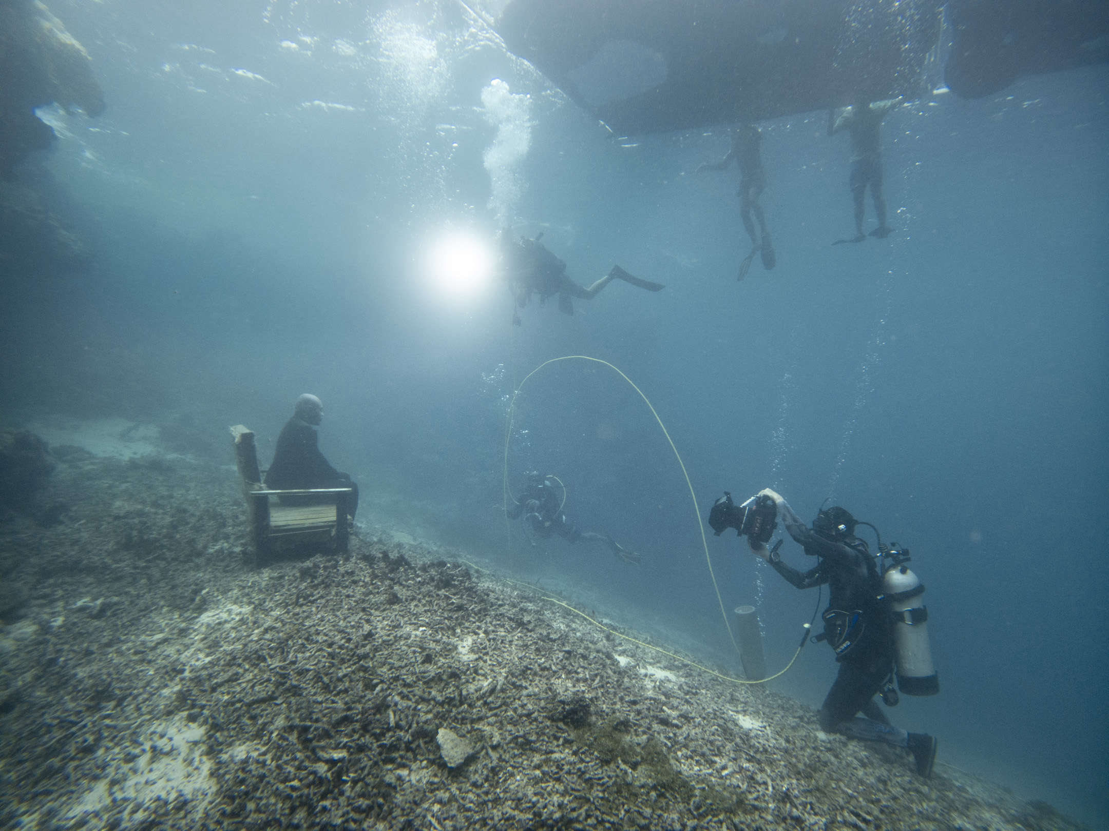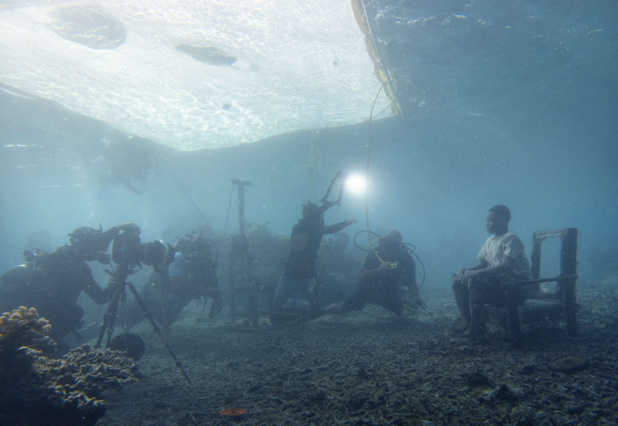 On how many shoots and in how many places in the world would the cast, when no longer needed, voluntarily help the crew? We experienced this for Chapter Two of The Day May Break in Bolivia, with some of the wonderful people that I photographed there. But here, the cast went further. Young and older, after I had finished photographing them, they would invariably jump back in the ocean to enthusiastically help out. They held the fabric frames over our heads in place on the surface for long periods, and they free dived down from the boat to us with urgently needed extra weights and equipment (Fijian Underwater Couriers). Long may they continue their lives with such joy.