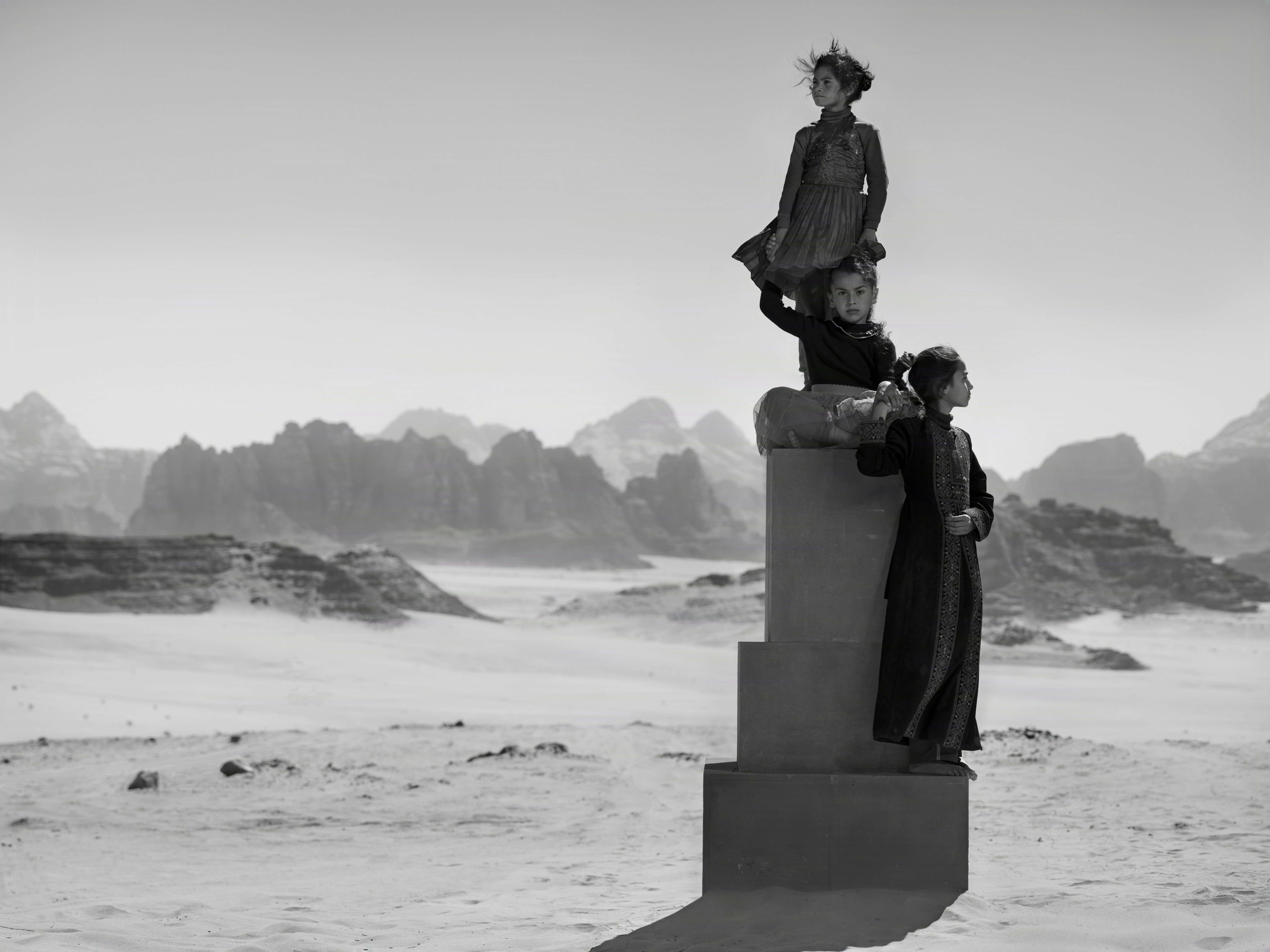 The images suggest meticulous attention to detail, from consideration of tone and movement of light, to shapes of faces and the direction of the wind; in the end, we find ourselves before a piece as intricate and cohesive as lace. Brandt’s work on the subjects’ gestures, their faces and foreheads, the light in their eyes and the selection of groupings—with the backdrop of mountains and desert, between peak and cave, sand and sky—results in photographs that brim with life, inviting questions while offering no answers. They deftly dismantle our ready-made assumptions and give rise to tomes of questions, floating gently in extended silence.